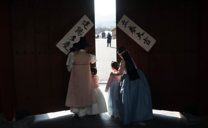 입춘을 맞은 4일 오전 남산 한옥마을에서 입춘첩을 붙인 가족이 대문을 열고 있다.