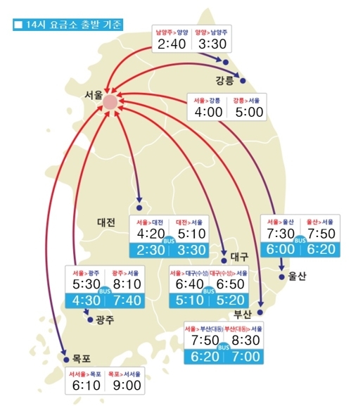 한국도로공사에 따르면 이날 오후 2시 승용차로 서울요금소를 출발해 전국 주요 도시까지 도착하는 데 걸리는 시간은 부산 7시간50분, 목포 6시간10분, 광주 5시간30분, 울산 7시간30분, 대구 6시간40분, 강릉 4시간, 대전 4시간20분이다.