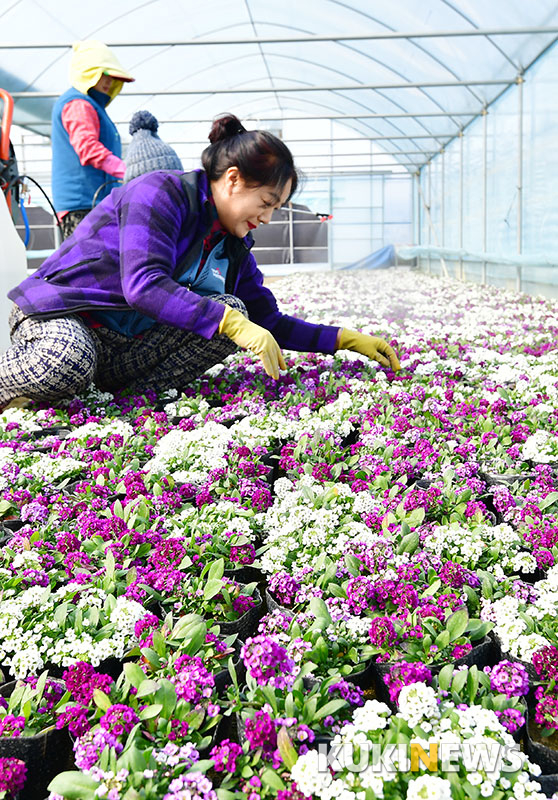 서울 낮 최고 기온이 4도까지 오른 12일 오후 경기 고양시 덕은양묘장에서 관계자들이 알리섬을 가꾸고 있다.