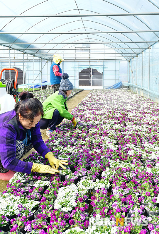 서울 낮 최고 기온이 4도까지 오른 12일 오후 경기 고양시 덕은양묘장에서 관계자들이 알리섬을 가꾸고 있다.