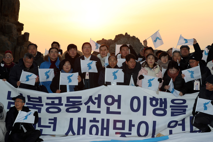 13일 오전 해금강에서 '남북공동선언 이행을 위한 2019년 금강산 새해맞이 연대모임' 참석자들이 해맞이 행사를 하고 기념 촬영을 하고 있다.