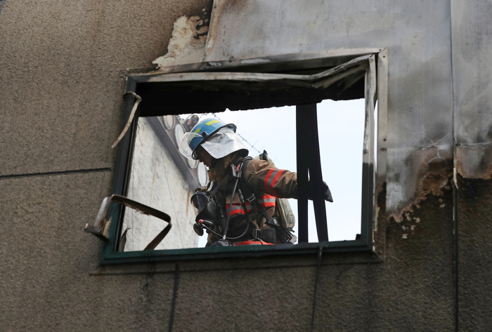 14일 오후 화재가 발생한 서울 중구 을지로4가 철물점에서 소방대원들이 잔불 진화 작업을 벌이고 있다.
