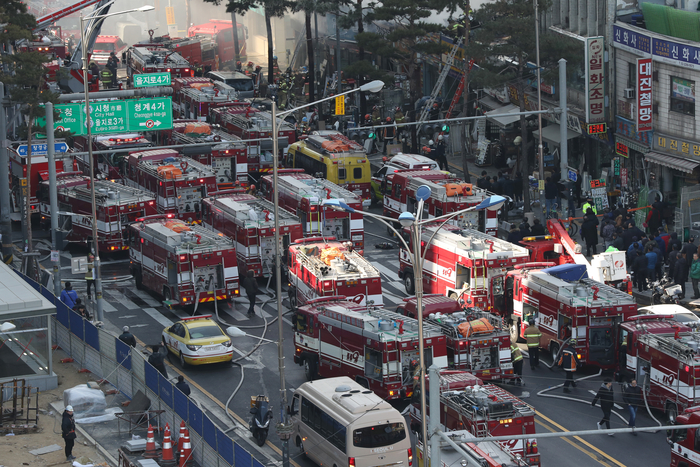14일 오후 화재가 발생한 서울 중구 을지로4가 철물점 인근 도로가 출동한 소방차로 가득하다.