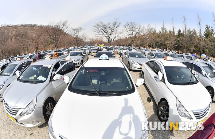 택시 미터기 교체 작업이 시작된 18일 오전 서울 마포구 난지천 공원 주차장에 택시들이 순서를 기다리고 있다.