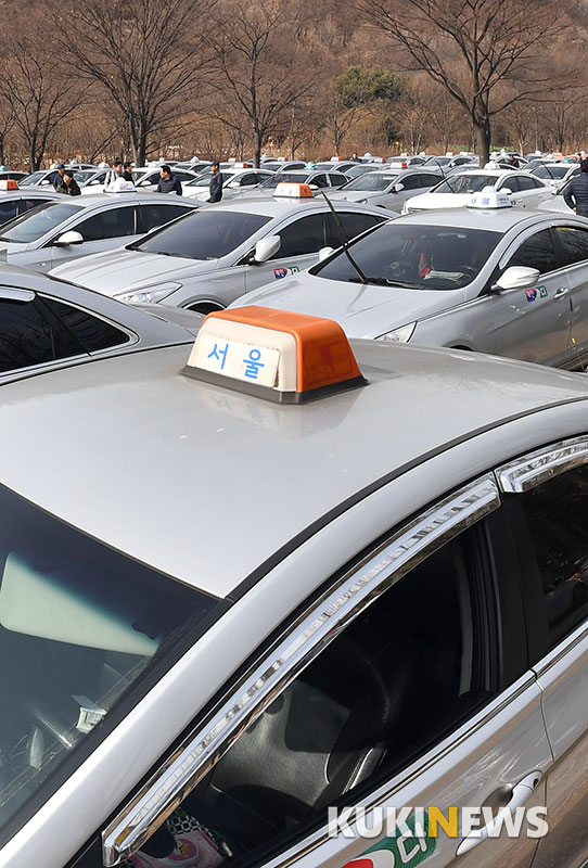택시 미터기 교체 작업이 시작된 18일 오전 서울 마포구 난지천 공원 주차장에 택시들이 순서를 기다리고 있다.