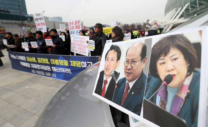 대구경북진보연대 등 대구·경북지역 66개 시민사회단체가 18일 오후 대구 엑스코 앞에서 5·18과 관련해 부적절한 발언을 한 세 의원 제명과 한국당 해산 요구하는 집회를 하고 있다.
