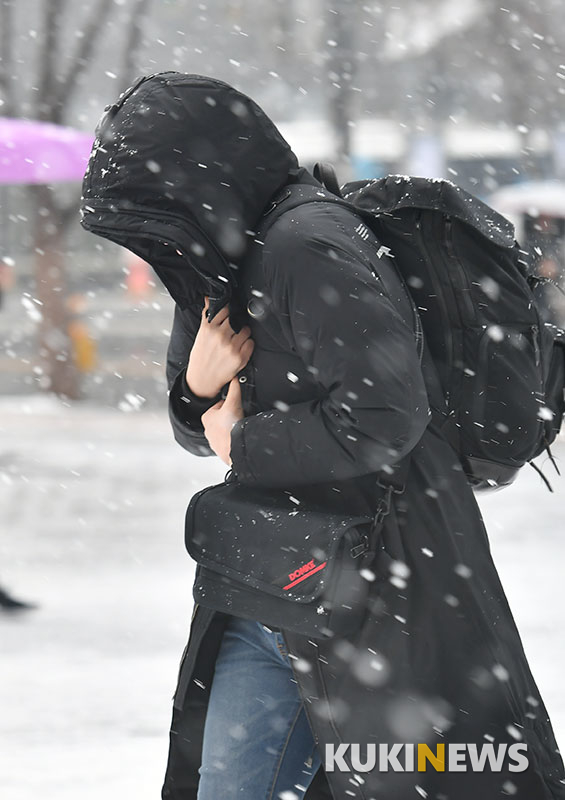 절기상 우수(雨水)이자 정월대보름인 19일 오전 서울 상암동에서 한 시민이 눈을 맞으며 출근하고 있다.