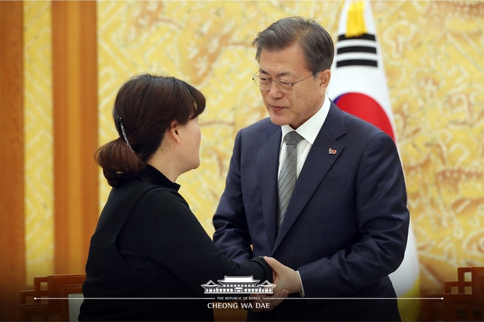 문재인 대통령이 18일 오후 청와대에서 태안화력 발전소에서 사고로 숨진 비정규직 노동자 고 김용균 씨 어머니 김미숙 씨를 비롯한 유가족을 만나 위로하고 있다.