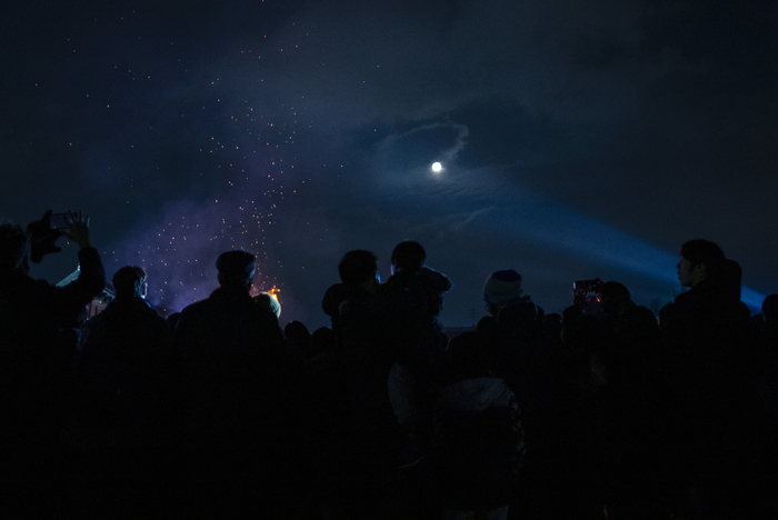 정월대보름인 19일 서울 남산한옥마을에서 열린 달집태우기 행사에 참석한 시민들이 보름달을 보고 있다.