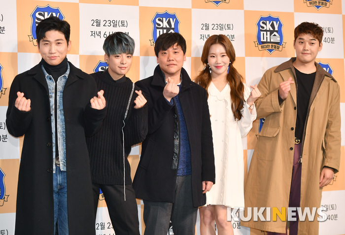 유세윤과 엠버, 정승일 PD, 주이, 권혁수(사진 왼쪽부터) 20일 오후 서울 마포구 서울가든호텔에서 열린 JTBC '위대한 운동장- SKY 머슬' 제작발표회에 참석해 포즈를 취하고 있다.
