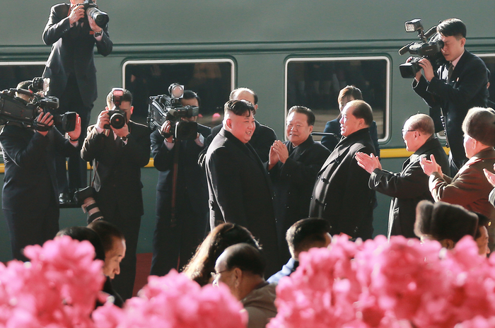 북한 노동당 기관지 노동신문은 24일 김정은 국무위원장이 제2차 북미정상회담이 열릴 베트남 하노이로 출발했다는 기사를 사진과 함께 1면에 게재했다. 사진은 밝은 표정의 김 위원장이 김영남 최고인민회의 상임위원장(김정은 뒷편), 오른쪽으로 최룡해 당 부위원장, 박봉주 내각 총리 등의 환송을 받고 있는 모습.