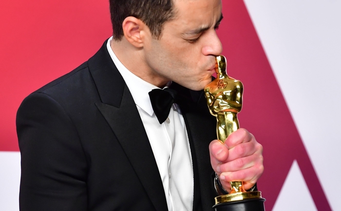 배우 라미 말렉이 25일(한국시간) 미국 LA 돌비극장에서 열린 '제91회 아카데미 시상식'에서 영화 '보헤미안 랩소디'로 남우 주연상을 받은 후 기뻐하고 있다.