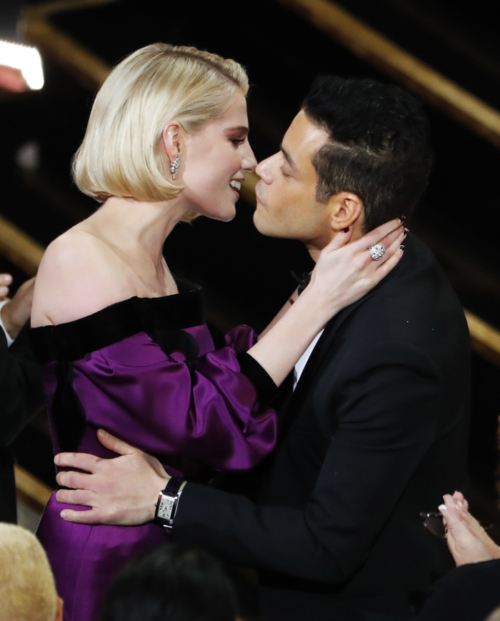 배우 라미 말렉이 25일(한국시간) 미국 LA 돌비극장에서 열린 '제91회 아카데미 시상식'에서 영화 '보헤미안 랩소디'로 남우 주연상에 호명된 후 연인 루시 보인턴과 키스하고 있다.