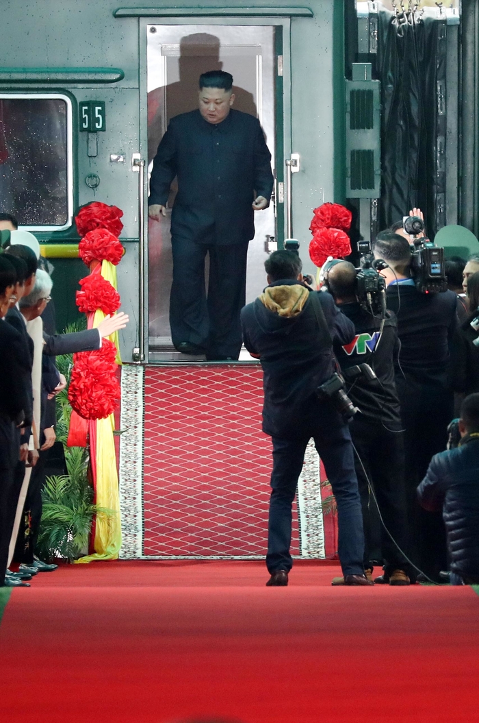 북미정상회담을 하루 앞둔 26일 김정은 북한 국무위원장이 중국과 접경지역인 베트남 랑선성 동당역에 도착해 특별열차에서 내리고 있다.