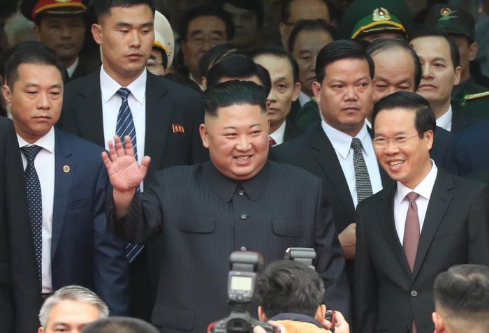 북미정상회담을 하루 앞둔 26일 김정은 북한 국무위원장이 중국과 접경지역인 베트남 랑선성 동당역에 도착해 현지 환영단에게 손 흔들고 있다.