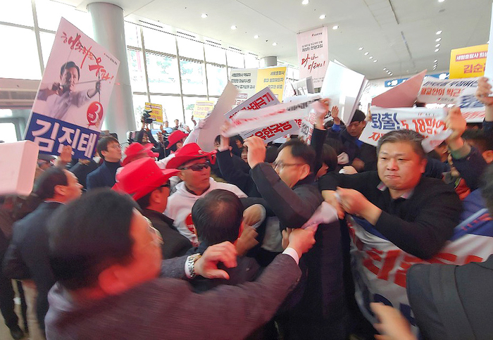자유한국당 전당대회가 열리는 27일 경기도 고양 킨텍스에서 민주노총 관계자들이 자유한국당은 해체하라며 구호를 외치고 있다.