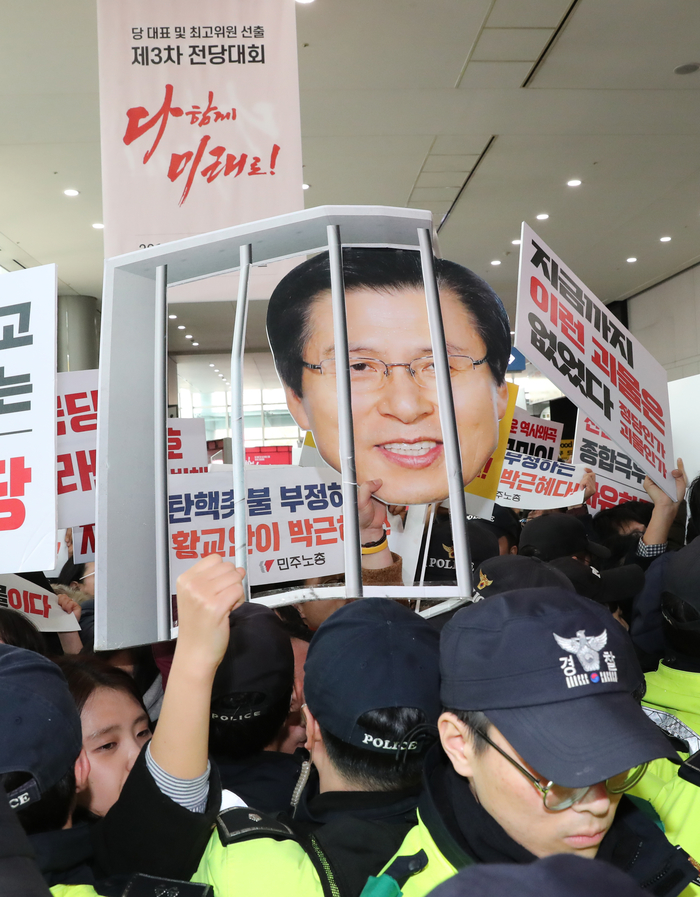 자유한국당 전당대회가 열리는 27일 경기도 고양 킨텍스에서 민주노총 관계자들이 자유한국당은 해체하라며 구호를 외치고 있다.