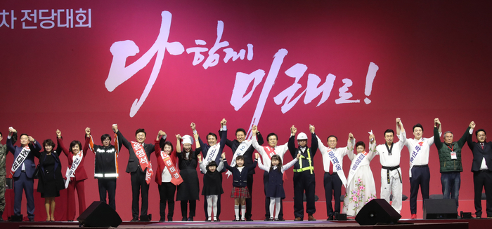 27일 오후 경기도 고양시 킨텍스에서 열린 자유한국당 전당대회에서 당 대표 후보, 최고위원 후보, 청년최고위원 후보들이 당원들에게 인사하고 있다.