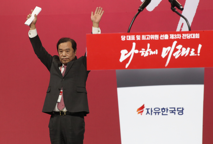 27일 오후 경기도 고양시 킨텍스에서 열린 자유한국당 전당대회에서 김병준 비대위원장이 인사말을 하고 있다.