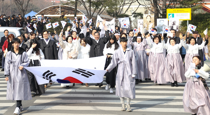 3·1절을 하루 앞둔 28일 오후 서울 양천구 목동 파리공원에서 열린 3·1절 100주년 기념 만세운동 재현 행사에서 참석자들이 '대한독립만세'를 외치며 거리행진을 하고 있다.
