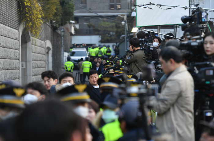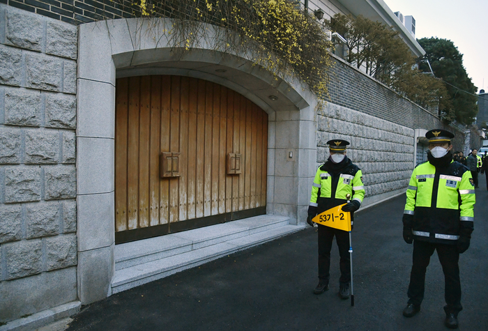 11일 오전 서울 서대문구 연희동 전두환 씨 자택 앞에서 경찰들이 대기하고 있다.