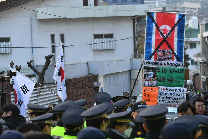 보수성향 단체인 ‘자유연대’ 등이 연희동 자택 앞에서 ‘전두환 전 대통령 광주재판 결사반대’ 집회를 열고 경찰과 대치하고 있다.