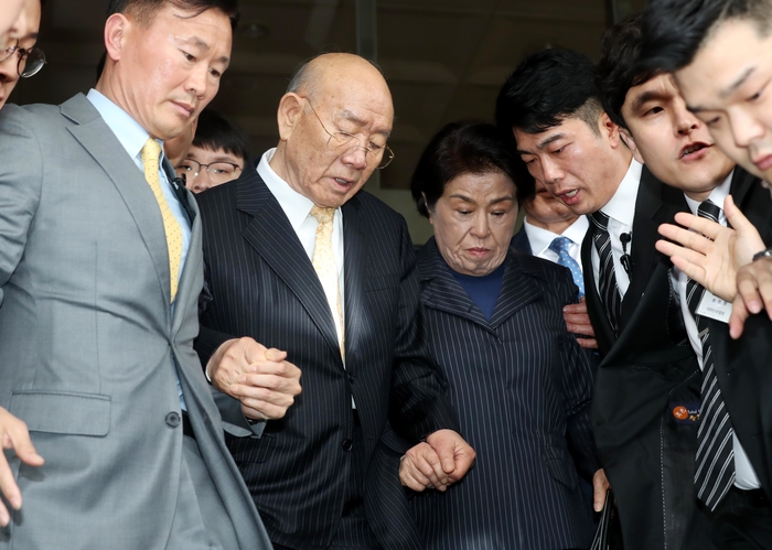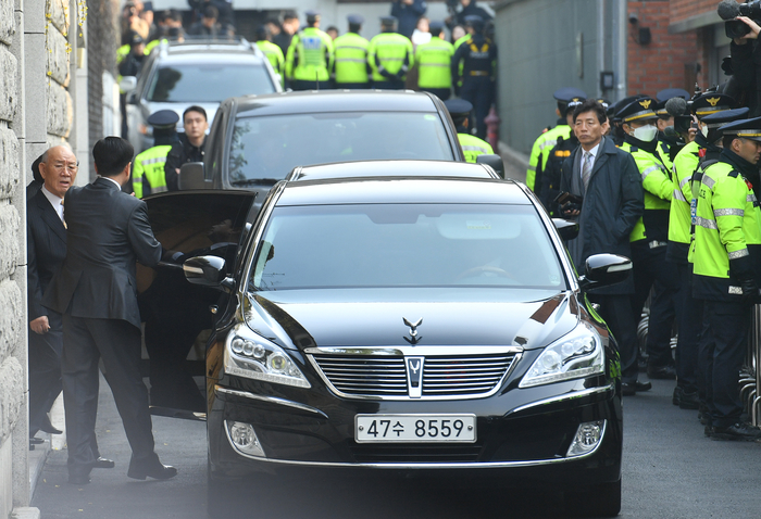 자택을 나서는 전두환 씨. 전씨의 부인인 이순자 여사도 신뢰관계인 자격으로 광주법원에 동행했다.