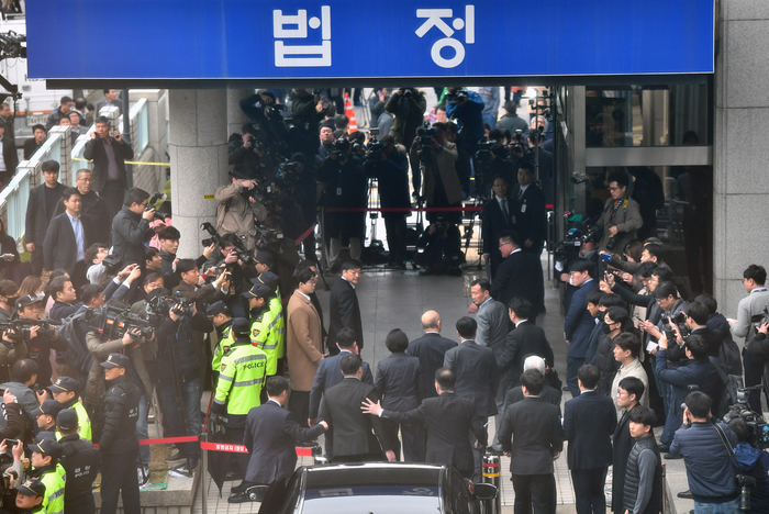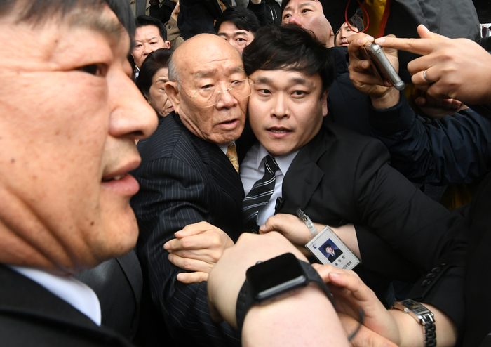 취재진을 뚫고 법정에 들어서는 전두환 씨.
