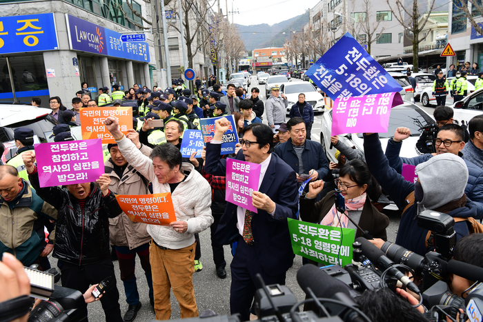 광주 시민들이 광주법원 앞에서 전두환 씨의 사죄를 촉구하는 구호를 외치고 있다.