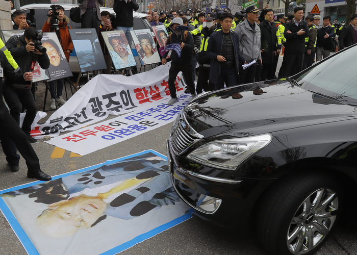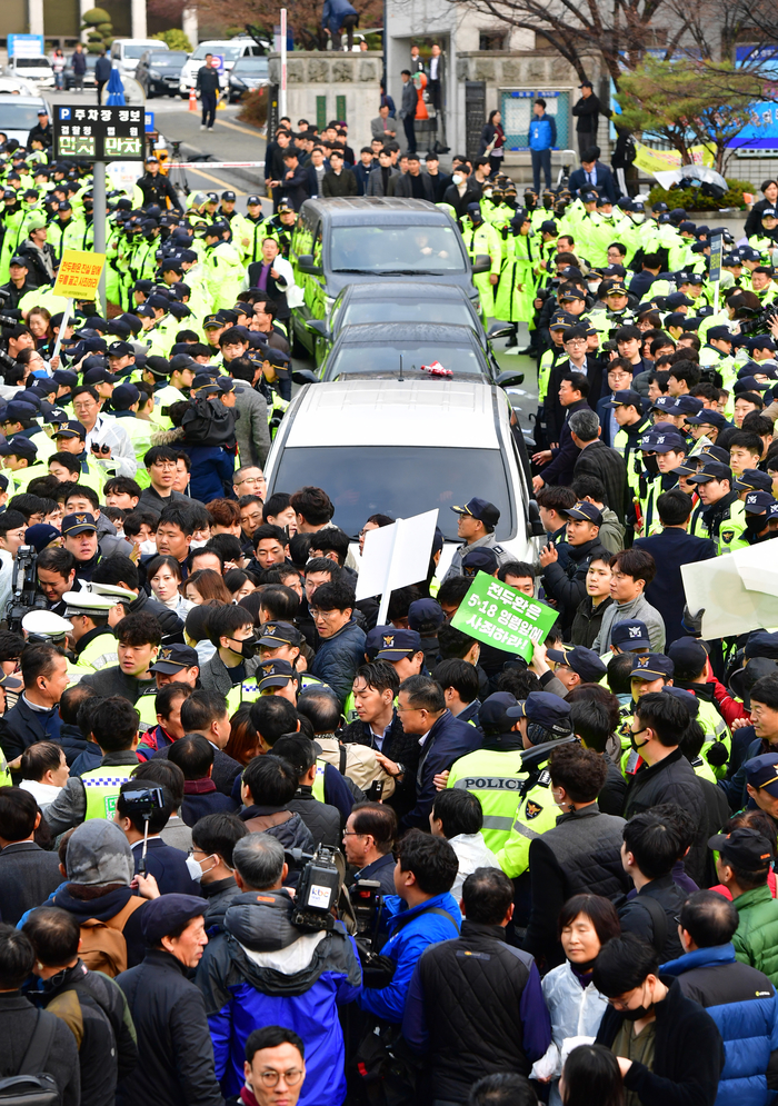 '사과하고 떠나라고!' 전두환 씨가 첫 재판을 마치고 광주법원을 빠져나가자 시위대가 법원 진입로를 막으며 항의하고 있다.