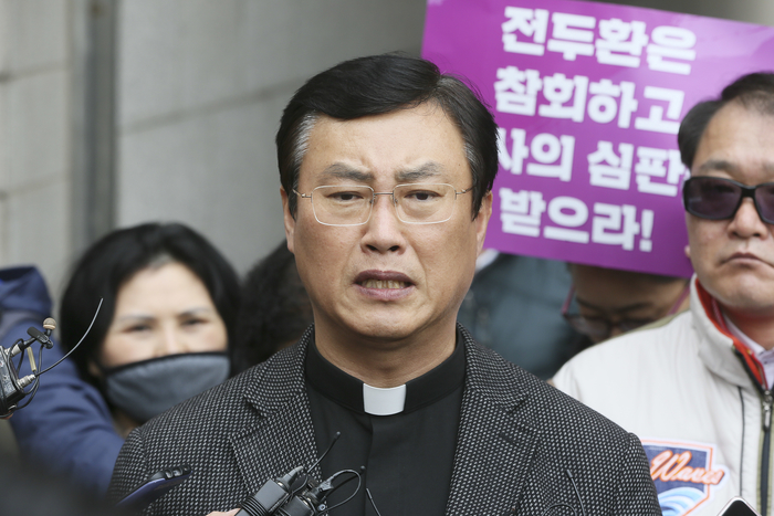 고 조비오 신부의 조카 조영대 신부가 광주법원 앞에서 취재진의 질문에 답하고 있다.