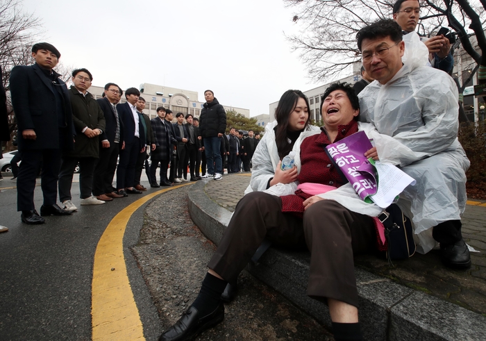 '나는 오늘도 웁니다' 전두환 씨가 5·18 민주화운동 관련 피고인으로 첫 재판을 마친 가운데 한 시민이 법원 입구에 주저앉아 울고 있다.