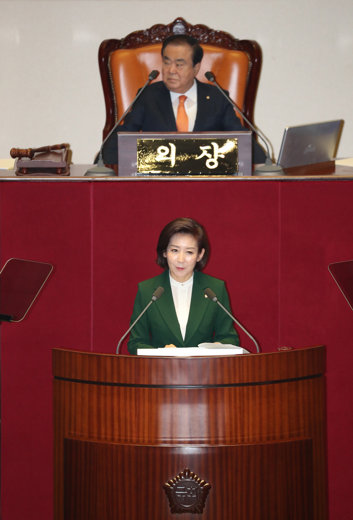 자유한국당 나경원 원내대표가 12일 오전 국회 본회의장에서 교섭단체 대표연설을 하고 있다.