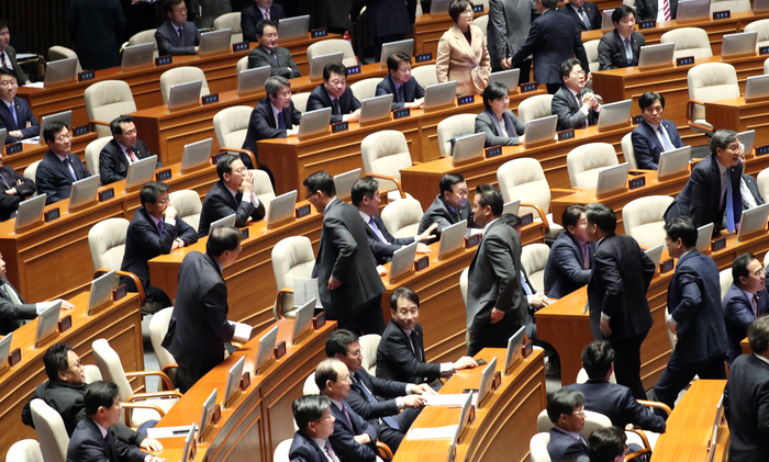 12일 오전 국회 본회의장에서 열린 자유한국당 나경원 원내대표 교섭단체 대표연설에서 민주당 몇몇 의원들이 나 대표의 발언에 항의하며 본회의장을 나가고 있다.