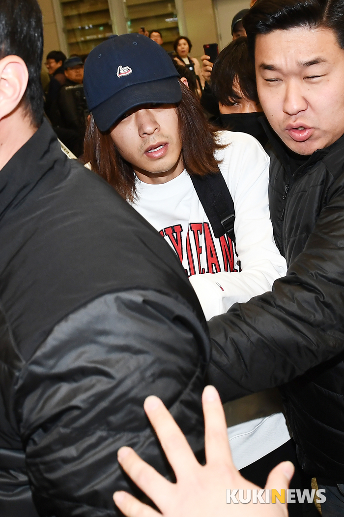 성관계 영상을 불법으로 찍어 지인들에게 유포한 의혹을 받고 있는 가수 정준영이 12일 오후 인천국제공항을 통해 귀국했다.