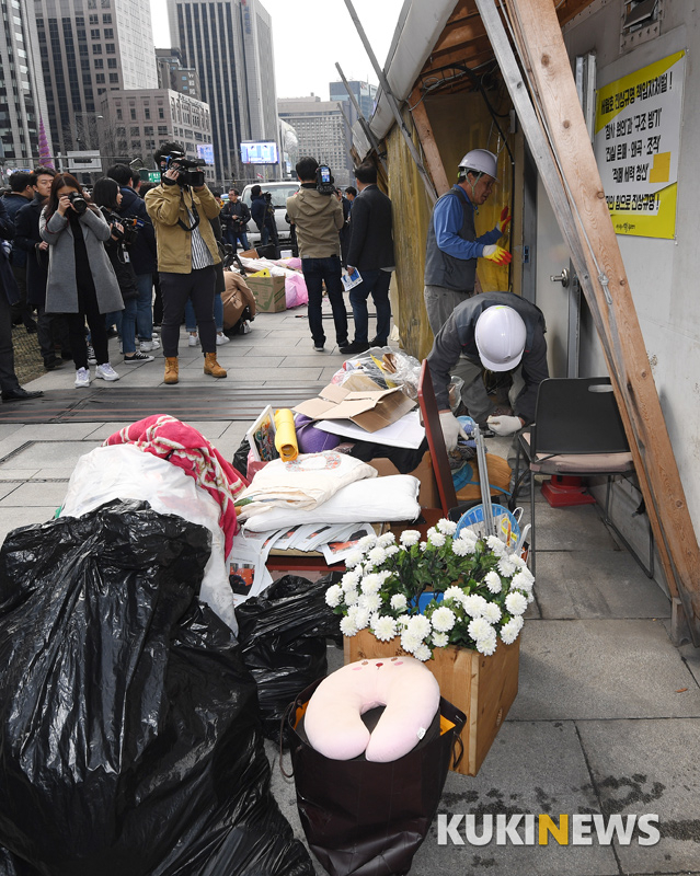 18일 서울 광화문광장에서 서울시 관계자들이 세월호 참사 희생자 및 미수습자 분향소 및 상징조형물을 철거하고 있다.