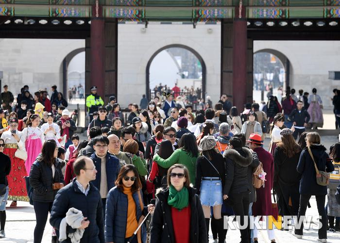 미세먼지 없이 낮 기온이 크게 오른 18일 오후 서울 경복궁을 찾은 관람객들이 포근한 봄 날씨를 만끽하고 있다.
