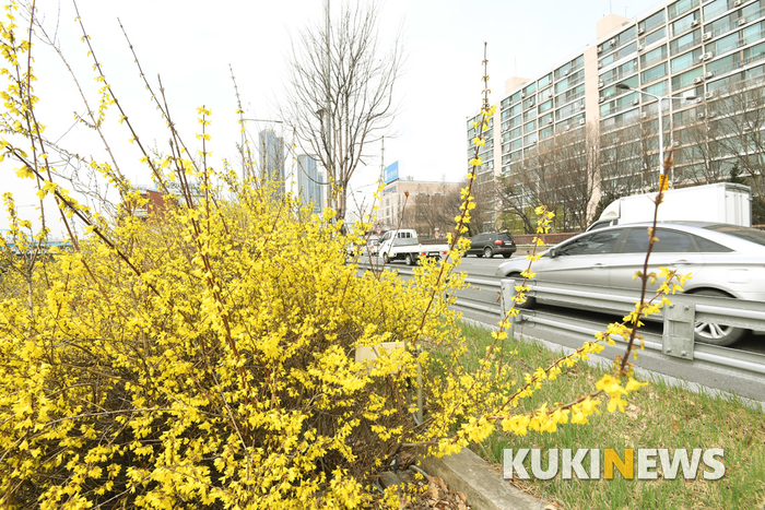 18일 오후 서울 강변북로에 개나리가 활짝 펴 봄소식을 알리고 있다.