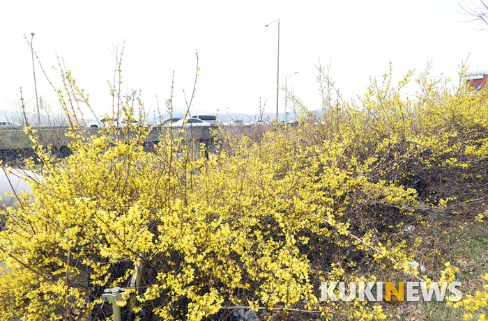 18일 오후 서울 강변북로에 개나리가 활짝 펴 봄소식을 알리고 있다.