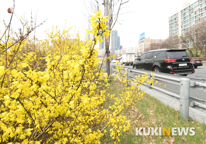 18일 오후 서울 강변북로에 개나리가 활짝 펴 봄소식을 알리고 있다.