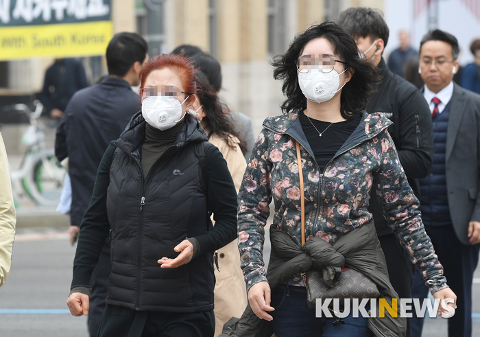 서울에 초미세먼지 주의보가 8일 만에 다시 발령된 가운데 20일 오전 서울 광화문 사거리에서 마스크를 쓴 시민들이 걸음을 재족하고 있다.