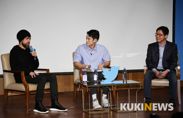 잭 도시 트위터 CEO(왼쪽)가 22일 서울 신라호텔에서 열린 '트위터 프레스 이벤트'에서 신창섭 트위터코리아 대표(오른쪽)와 취재진의 질문에 답하고 있다. 이날 진행은 배우 박재민이 맡았다.