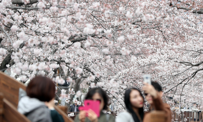 전국 최대 봄꽃 축제인 진해군항제 개막이 일주일 앞으로 다가온 25일 오후 경남 창원시 진해구 여좌천 일대에 벚꽃이 활짝 폈다.