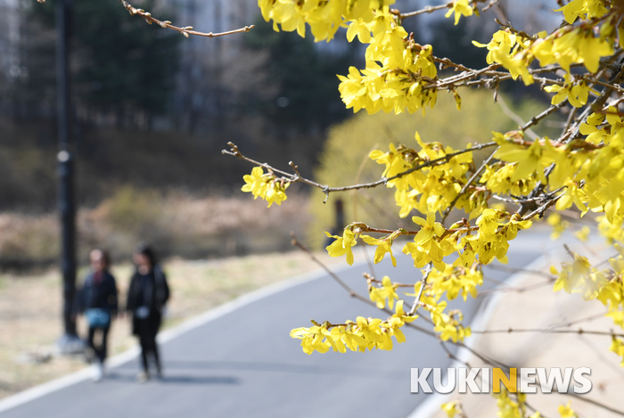 전국이 포근한 날씨를 보인 26일 오후 경기 성남시 탄천에서 공공근로자들이 꽃을 심고 있다.