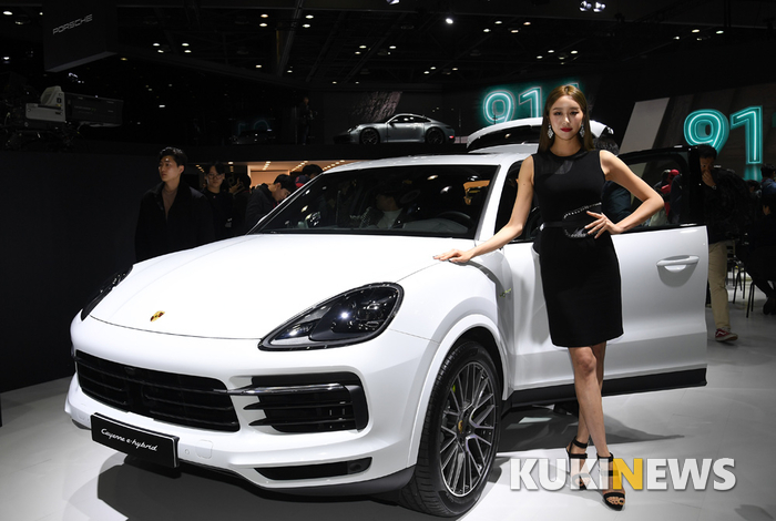 28일 오전 경기도 고양시 킨텍스에서 '2019 서울모터쇼' 프레스데이가 열렸다. 이날 포르쉐 부스에서 한 모델이 카이엔 하이브리드와 포즈를 취하고 있다.