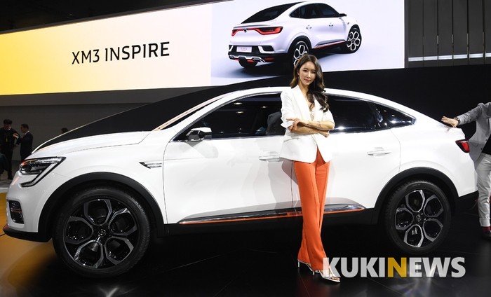 28일 오전 경기도 고양시 킨텍스에서 '2019 서울모터쇼' 프레스데이가 열렸다. 이날 르노삼성 부스에서 한 모델이 XM3 인스파이어와 포즈를 취하고 있다.