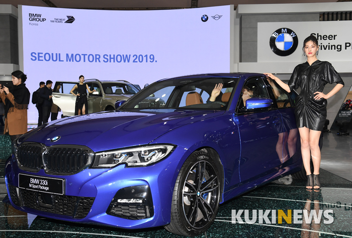 28일 오전 경기도 고양시 킨텍스에서 '2019 서울모터쇼' 프레스데이가 열렸다. 이날 BMW 부스에서 한 모델이 330i와 포즈를 취하고 있다.
