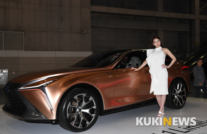 28일 오전 경기도 고양시 킨텍스에서 '2019 서울모터쇼' 프레스데이가 열렸다. 이날 렉서스 부스에서 한 모델이 콘셉트카 LF-1 리미트리스와 포즈를 취하고 있다.