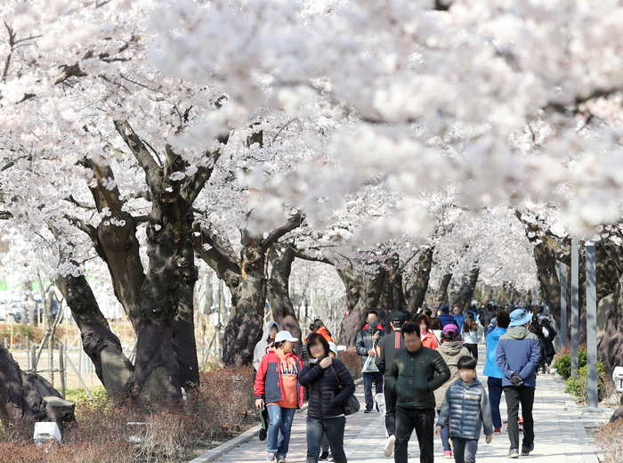 31일 오전 벚꽃축제가 열린 울산시 울주군 삼남면 작천정 일대에서 시민이 활짝 핀 벚꽃을 감상하고 있다.