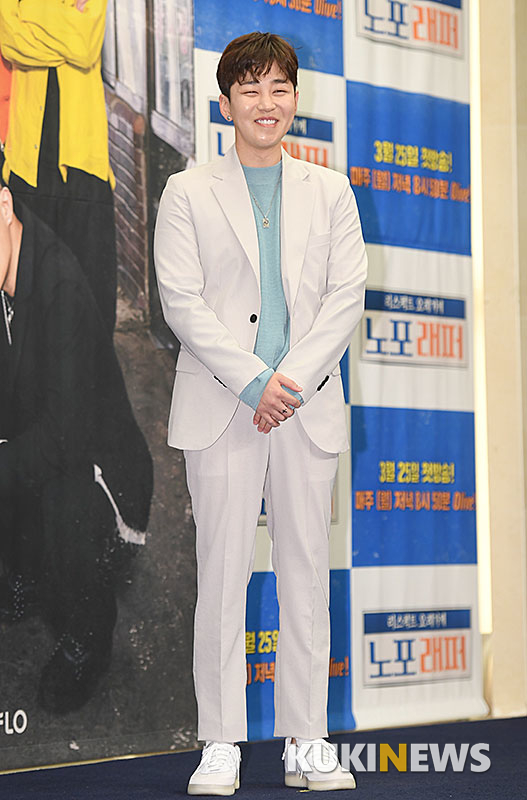 래퍼 딘딘이 1일 오전 서울 마포구 상암동 스탠포드호텔에서 열린 올리브 '노포래퍼'(석정호 연출) 제작발표회에 참석해 포토타임을 갖고 있다.